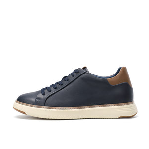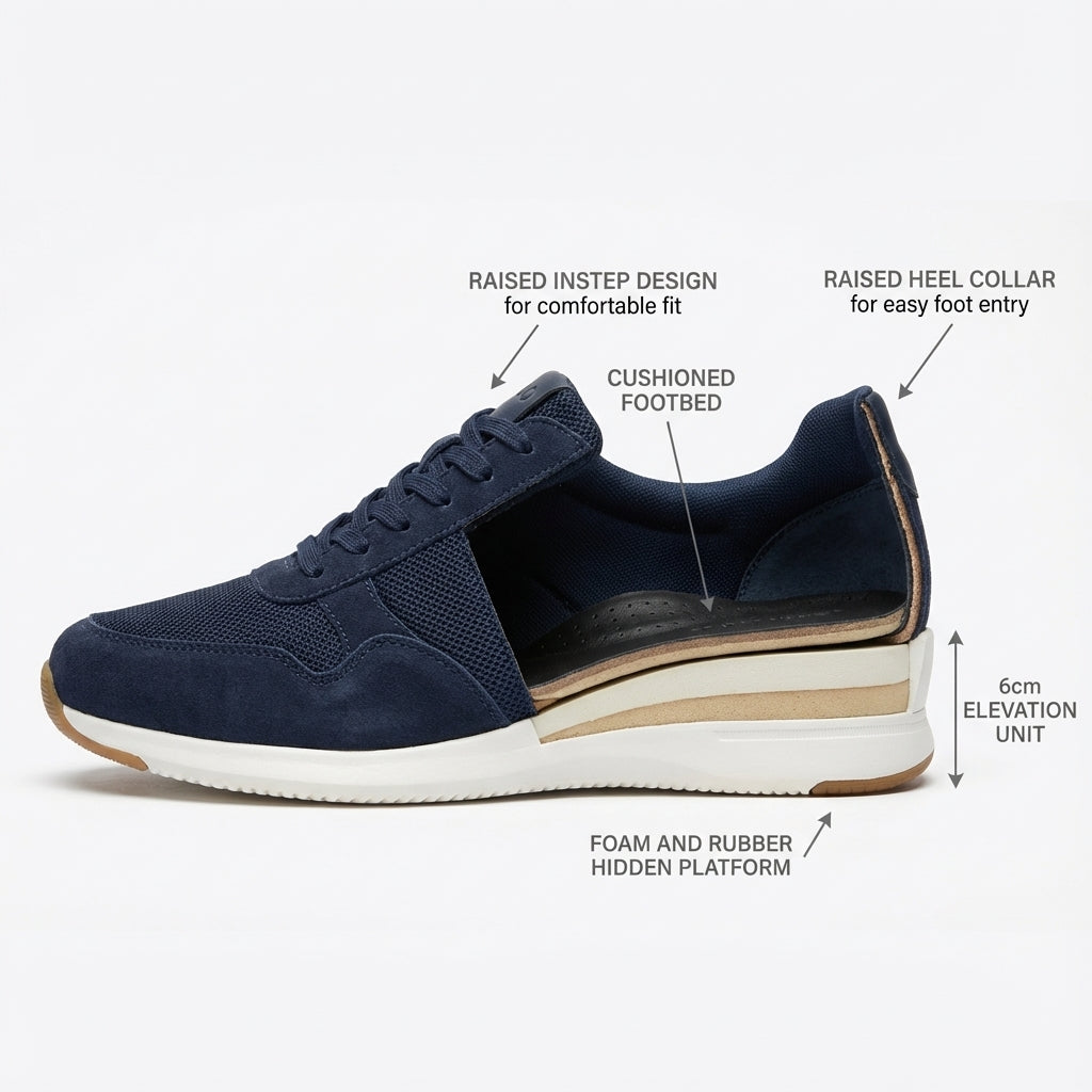 Two-tone European-style sneakers in navy blue. Unique color-block design with hidden +6cm height boost. Stand out from the crowd with sophisticated flair.